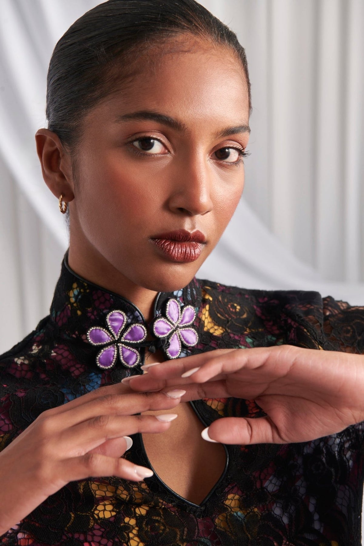 The Lys Dress is a seductive mini crafted in black lace with subtle multicolor accents.