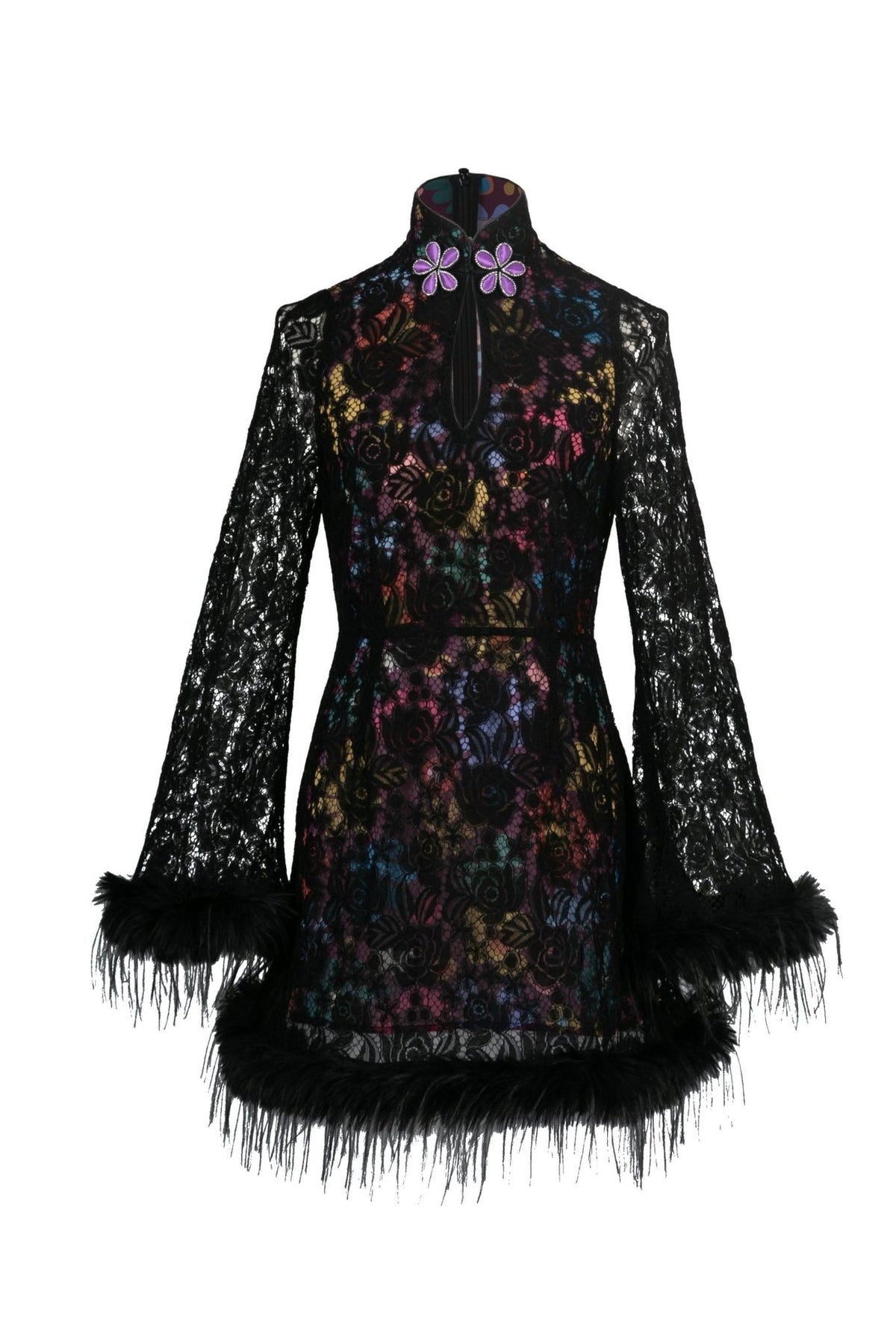 Featuring a high collar with floral appliqué, flared sleeves, and feather-trimmed cuffs and hemline, it balances drama and elegance. A statement piece that channels vintage glamour with a modern twist.