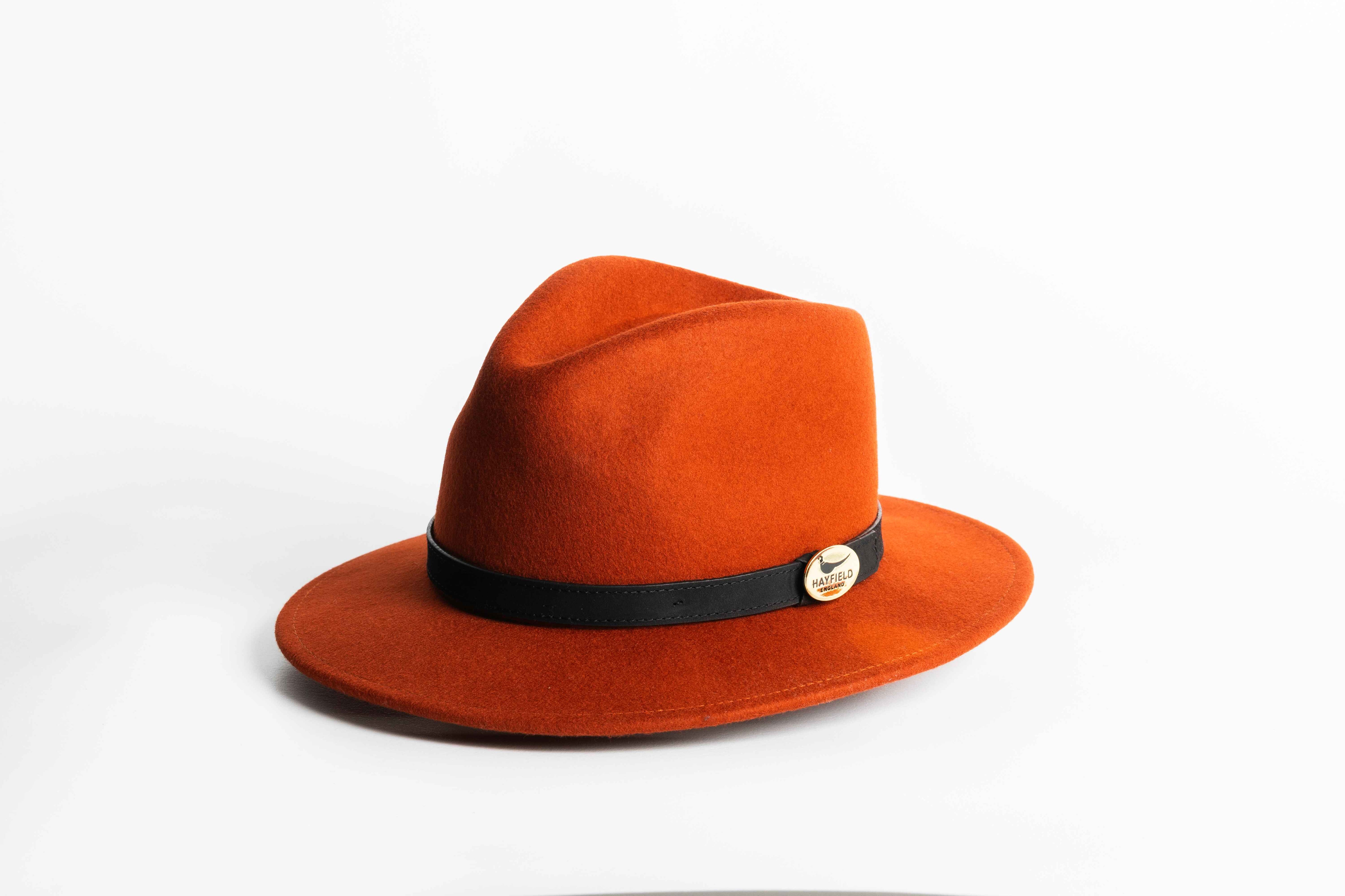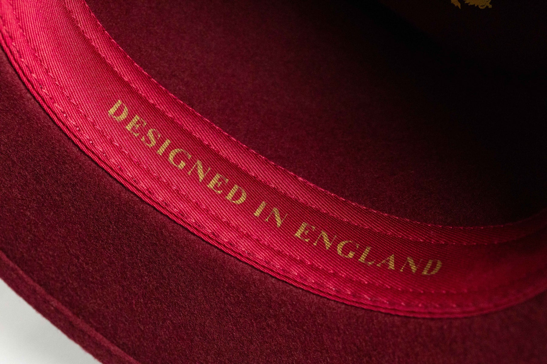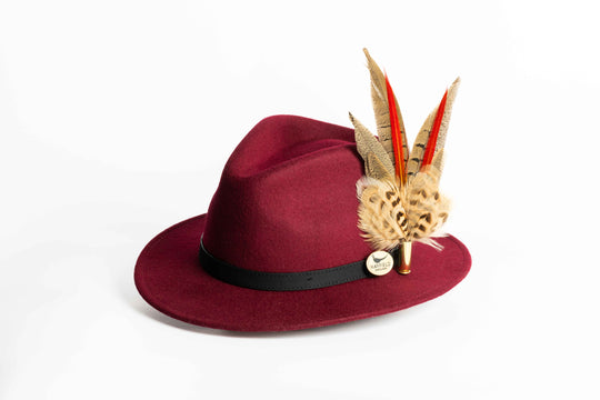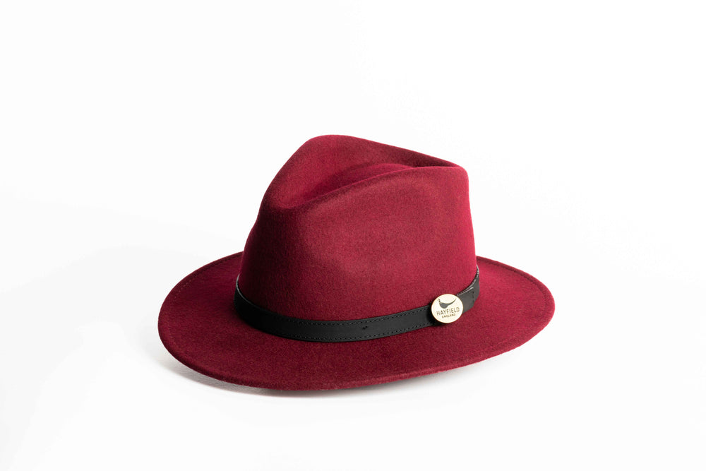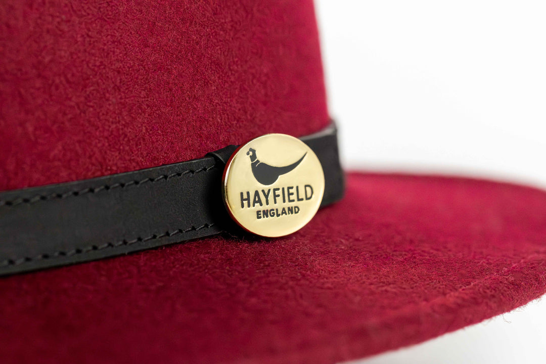 A hand-crafted Maroon Fedora made from 100% wool, this hat is crushable and showerproof. With an inner band to provide comfort and a real leather band finished with a solid brass Hayfield England decal it is designed to add a classic finish to your countryside attire.