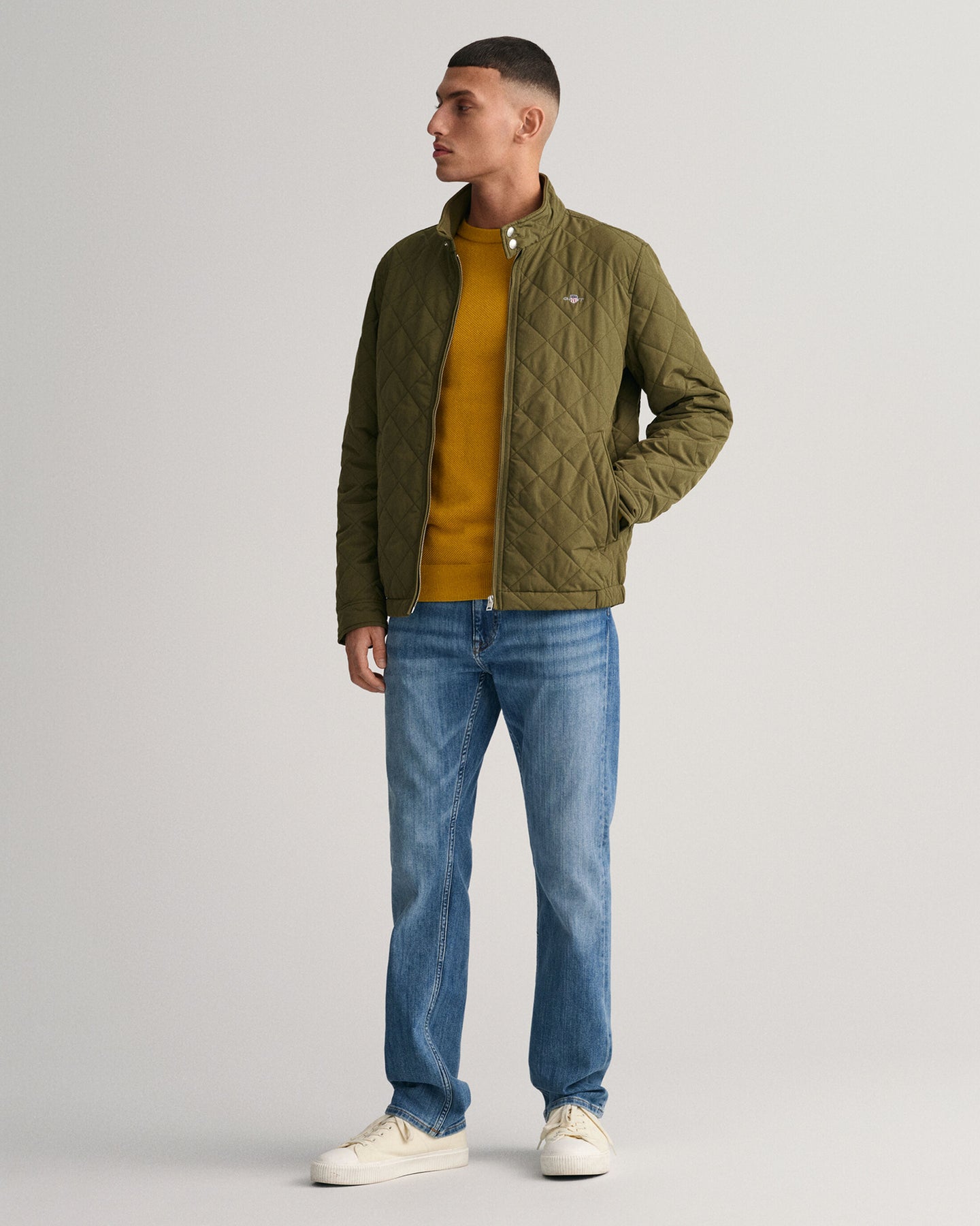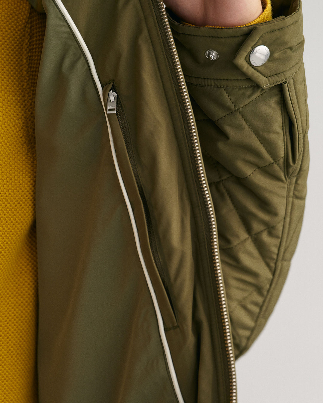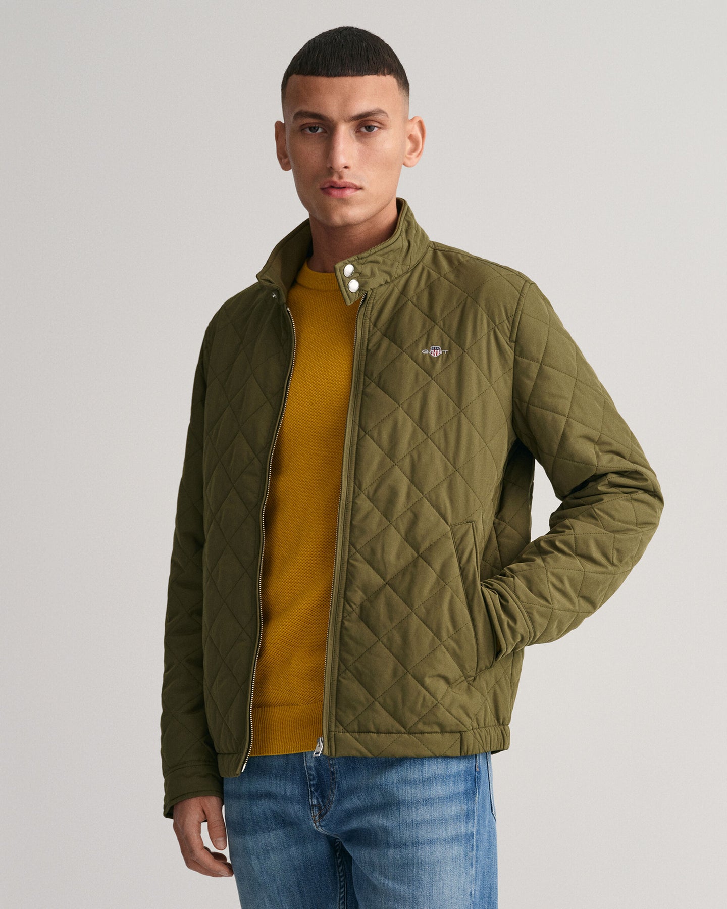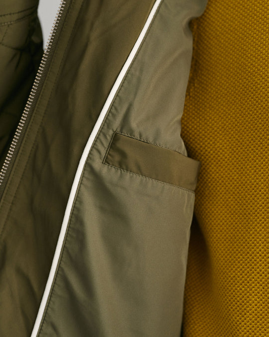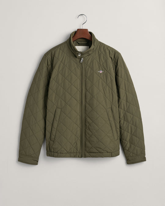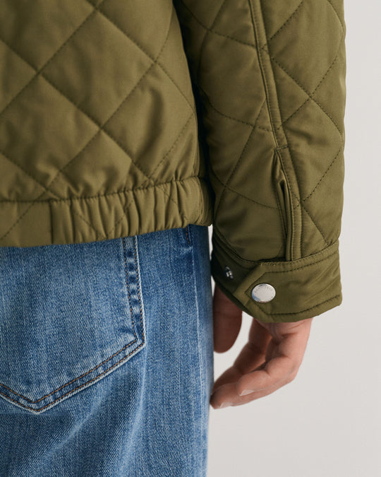 Crafted in a diamond quilting structure, this Quilted Windcheater Jacket features recycled polyester padding and is treated with a water-repellent finish. Design details include a one-way zipper at the front, snap buttons at the collar, slanted welt side pockets and an elasticated hem and cuff with a press button adjuster.