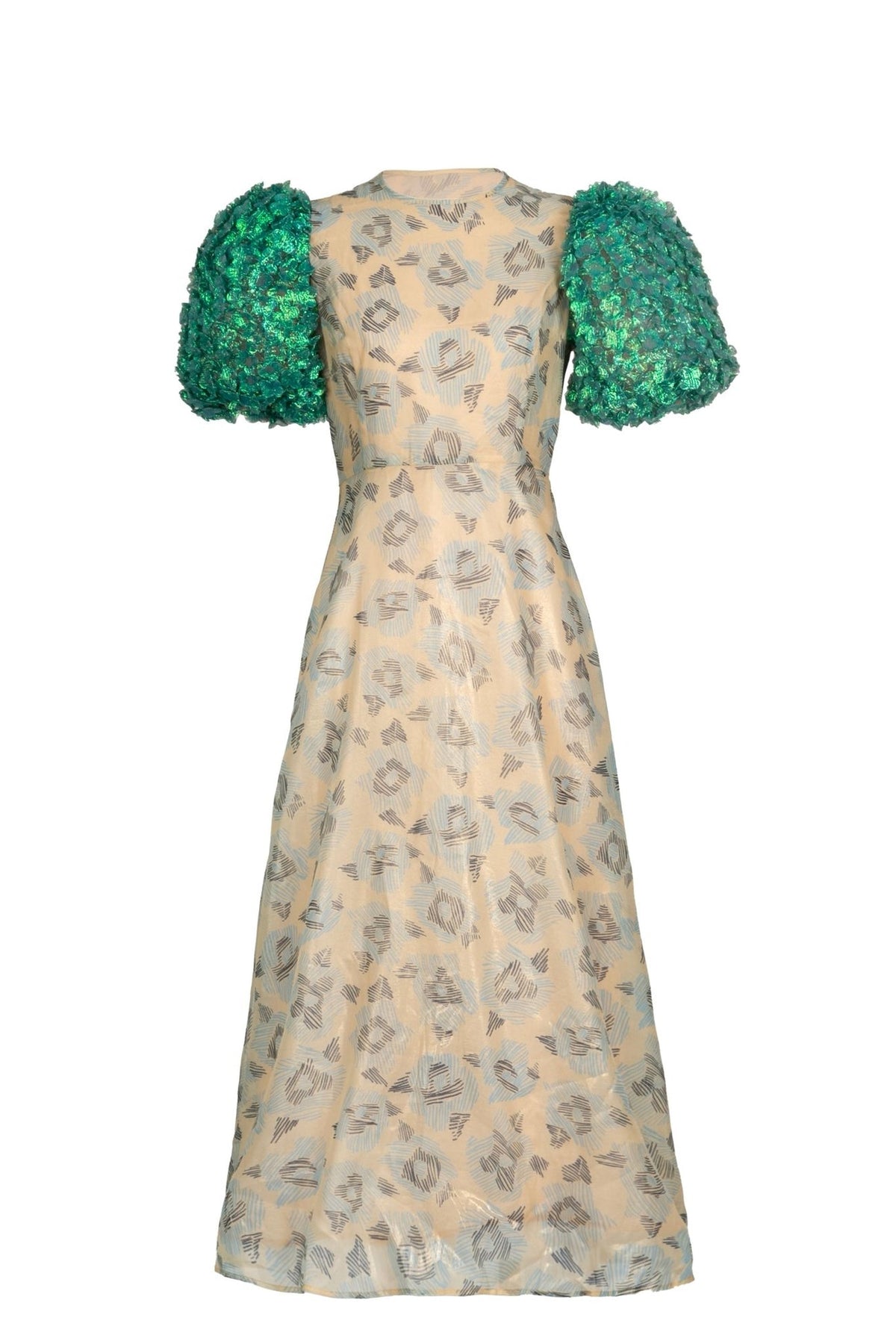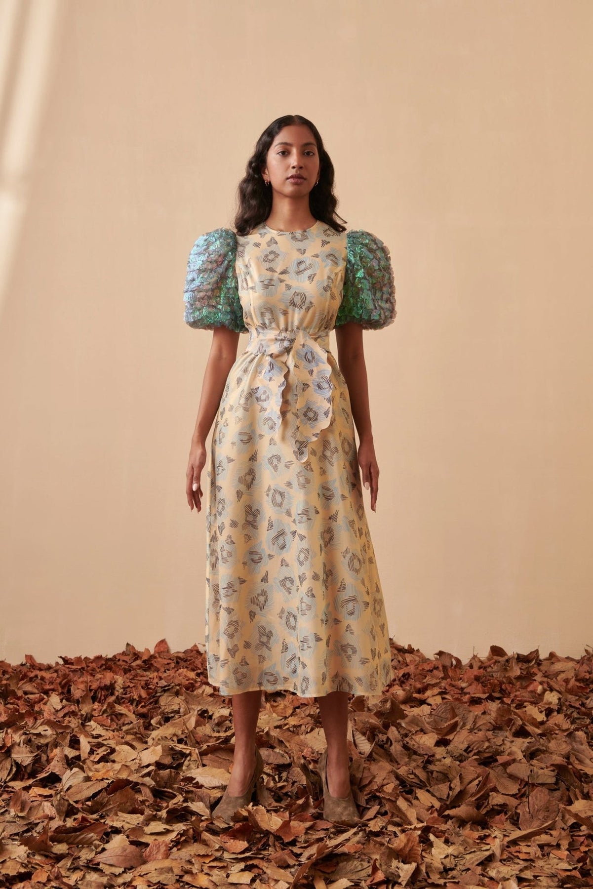 Crafted in a soft cream base with delicate blue abstract prints, it features dramatic textured puff sleeves in contrasting teal lace and a waist tie for a flattering silhouette. Perfect for any formal situation.