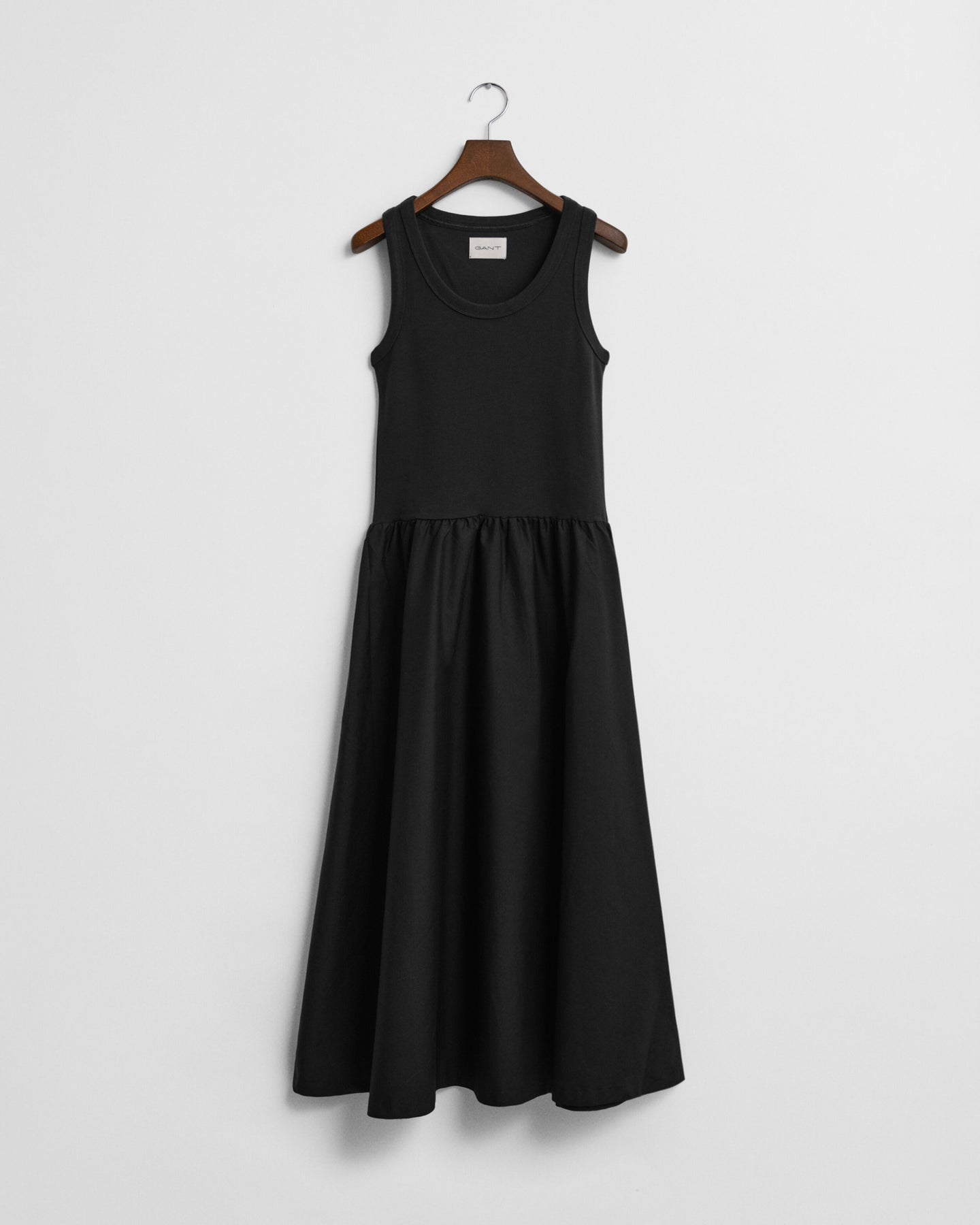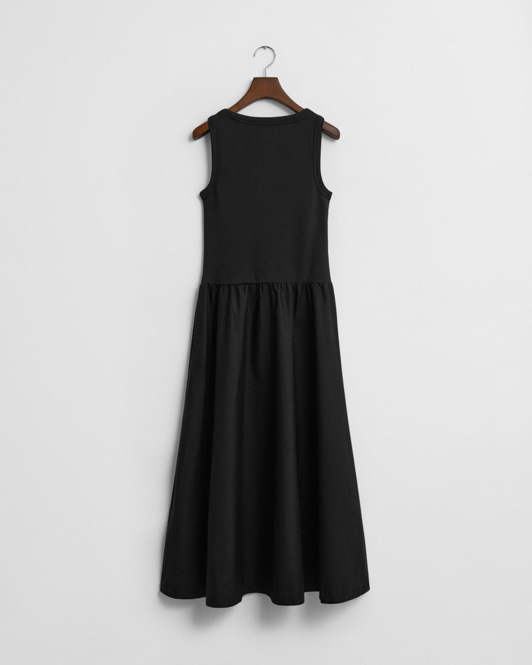 Elevate your style with the GANT Jersey Woven Midi Dress. Perfect for any occasion, this modern wardrobe staple combines comfort and sophistication with its cotton and jersey fabric.