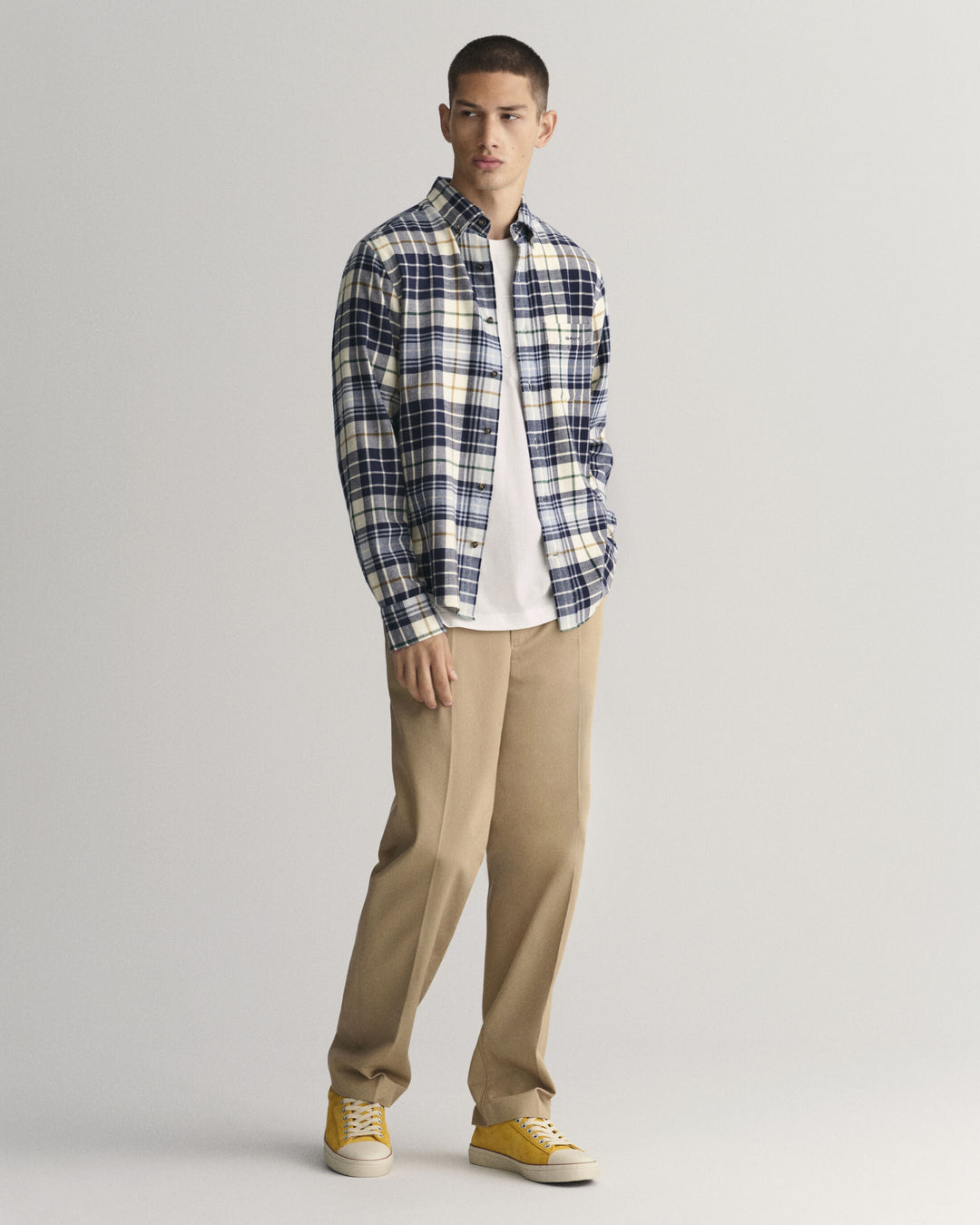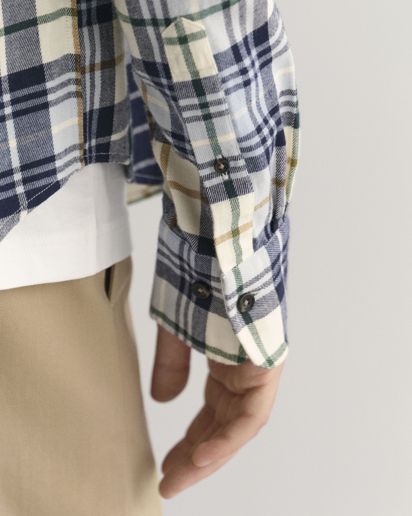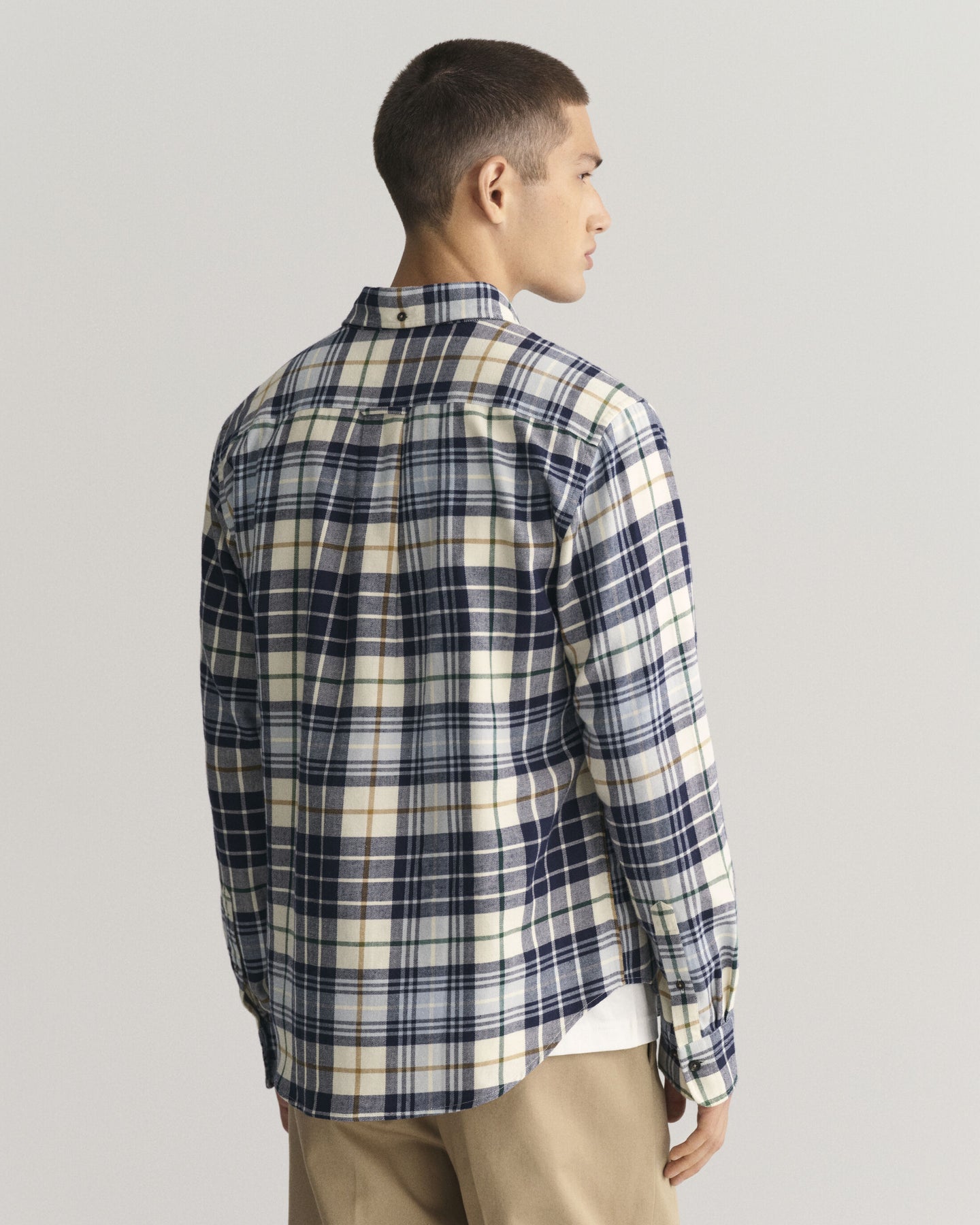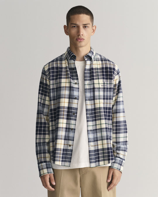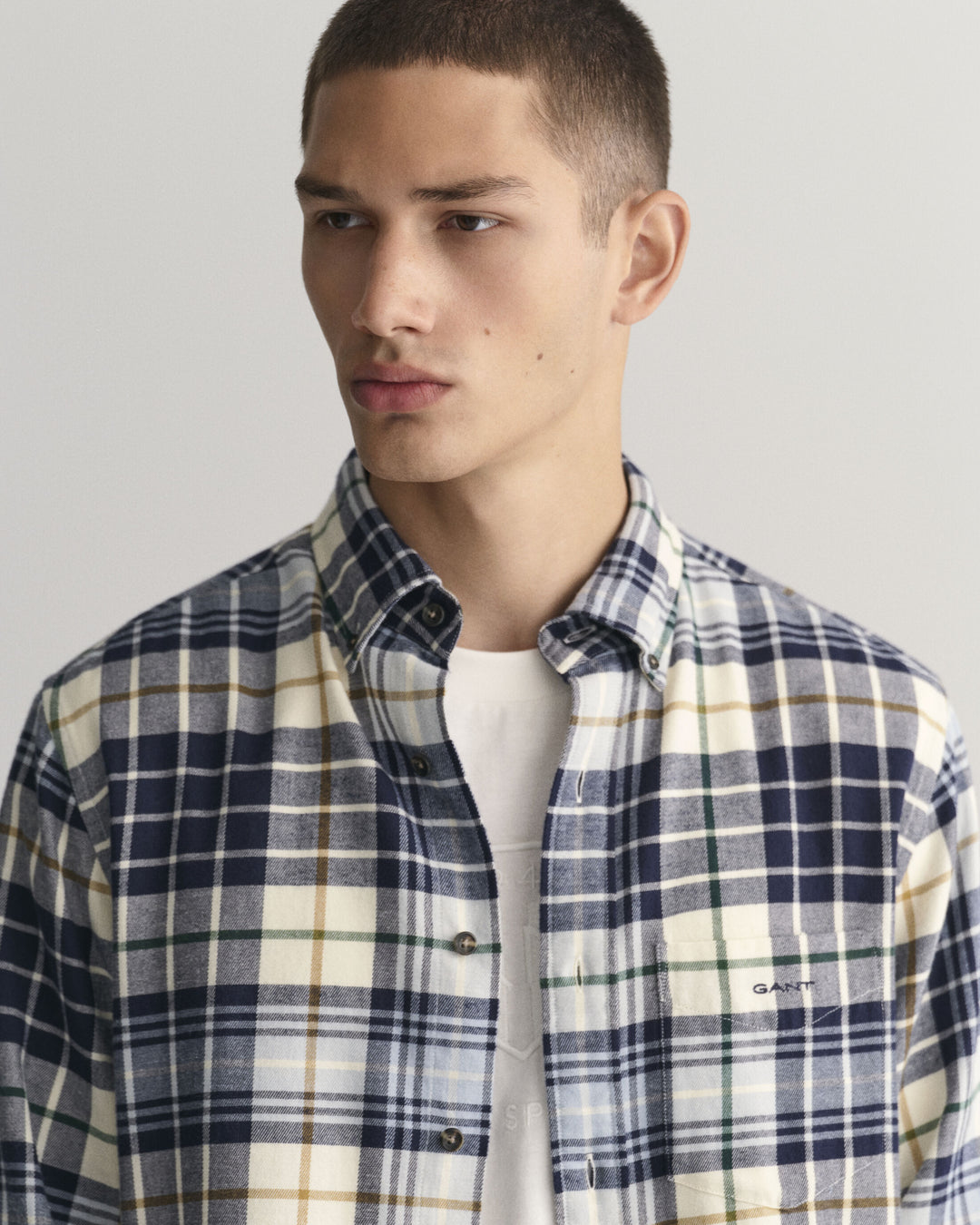 Crafted from a comfortable cotton blend, this shirt is cut for a regular fit and features an all-over flannel checked pattern. The classic design is fashioned with a button-down collar, adjustable sleeve cuffs, imitation horn buttons and a GANT logo embroidered at the chest pocket.